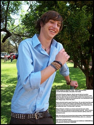 2010-04-07 Virginia Keppler, Beeld reports that yet another Afrikaner family has been targetted by senseless murder on the same day when the local provincial ANC-leaders were standing on a public platform calling for the mass-murder of all Afrikaners. Home schooled matric pupil Ernst Hoon, 18, was shot dead through a bedroom window of his family’s smallholding outside Pretoria. The boy’’s parents Deon and Brenette said he came stumbling into the bathroom, said "I've been shot" and died.