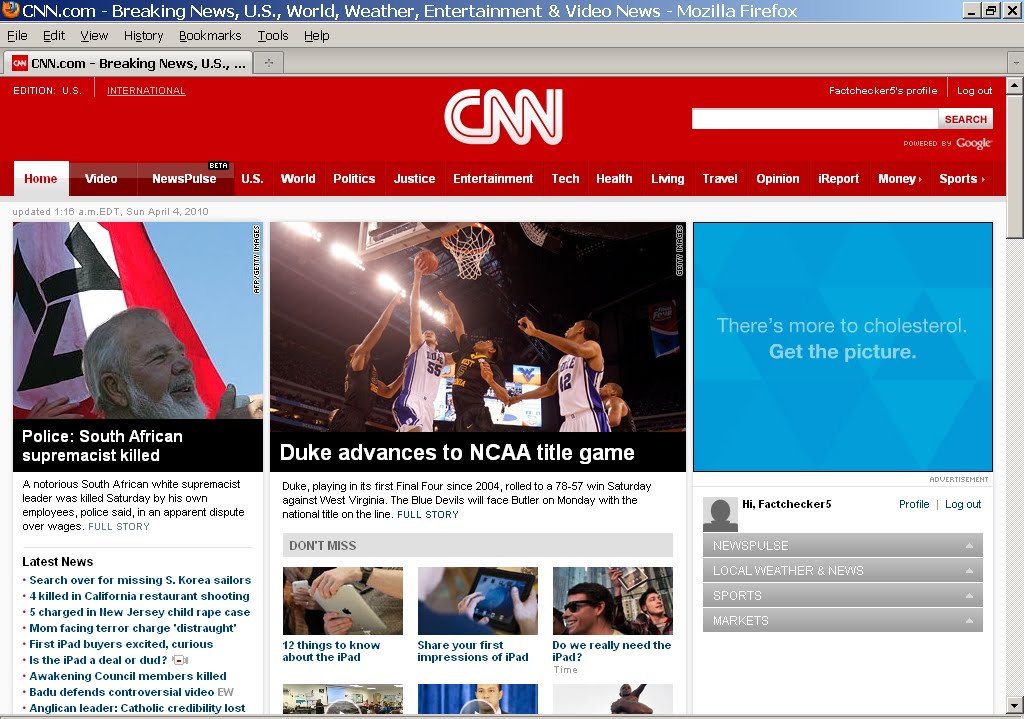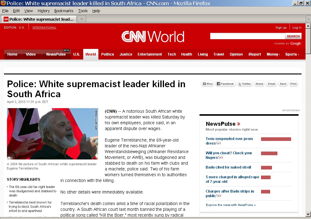 I learned about the brutal killing of Eugene Terre'Blanche on Saturday night when I visited the CNN web page [ which I do not do too often ] & was shocked [ but not surprised ] to learn that he had been killed in a brutal [ & cowardly ] manner. I was surprised to see that it was the main headline on the page but of course they distorted what he represented as it was not "White Supremacism" nor even White Separatism but Afrikaans & in particular Boer self determination.
