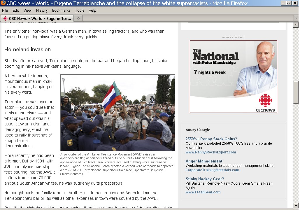 This of course was not the only flag that the media in general distorts as " an Apartheid era flag" as it appears to be some talking point the media have picked up on & turned into a meme & in the process are further discrediting themselves by displaying such bad journalism. One also must wonder if the man holding the flag in question is EVEN a member of the AWB or if that was FURTHER & yet another presumption on their part. Because if they in fact interviewed him & he in fact admitted to being a supporter of the AWB - you would think that they might have just asked him about the flag he was holding & verified it for themselves [ you know - that little thing called journalism ] instead of filing such an embarrassingly bad report. There really is no excuse for such bad journalism & Canadians would not like it very much if THEIR precious national flag [ or their own war flags for that matter ] were distorted in similar fashion.