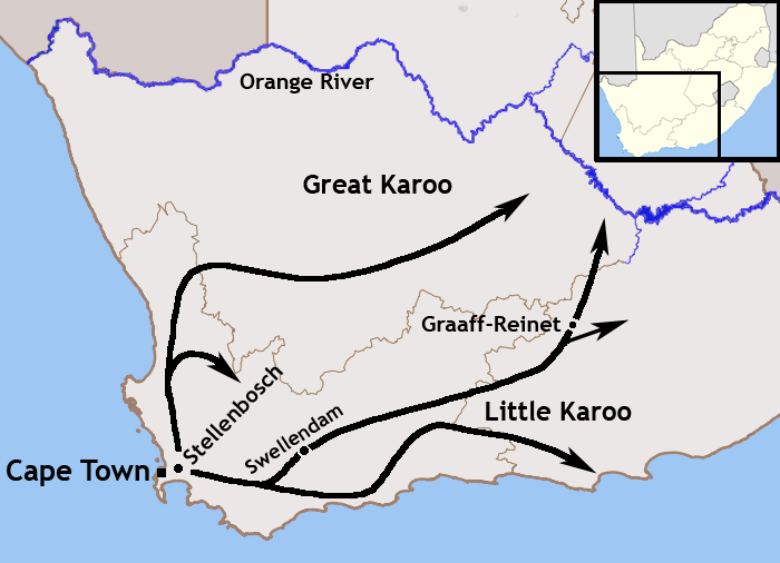 o not even know that the Great Trek was from the eastern Cape where the Boer population lived & not from the Western Cape of the Cape Dutch. This misunderstanding was typified when an American website host erroneously thought that the Great Trek was from Cape Town [ probably confusing the re-enactment which occurred during the centennial & started from Cape Town ] when the fact of the matter is that the Great Trek was virtually exclusively from the north eastern Cape frontier from towns like: Cradock / Uitenhage / Grahamstown / Swellendam / Somerset East / Graaff-Reniet etc. There were around 10 000 Boers at most who went on the Great Trek out of a total Cape Afrikaans speaking population of at least 30 000 - 40 000. The vast majority of the 30 000 - 40 000 Afrikaans speakers were the Western Cape based Cape Dutch.