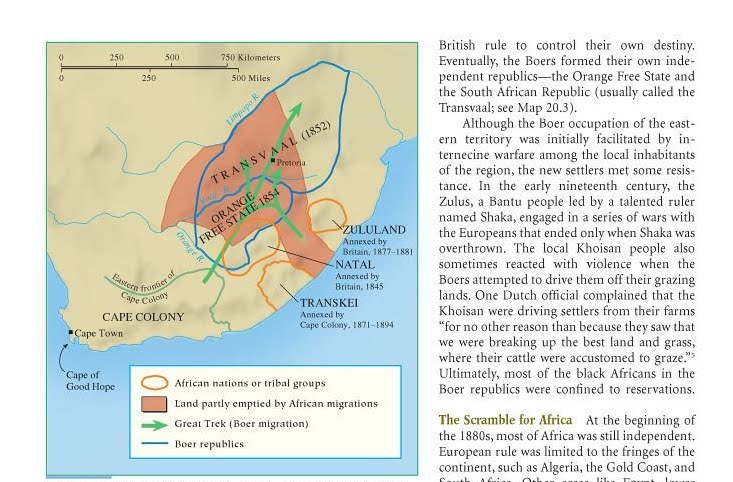 The above map taken from page 578 on World History: From 1500 By William J. Duiker, Jackson J. Spielvogel. This map shows how it was the Boers of the northeast Cape frontier who went on the Great Trek & that they settled into a depopulated region.