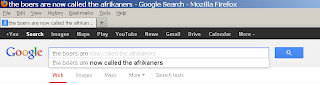 This raises some serious questions. Namely: who or what would go out of its way to Google-bomb [ the prolific typing of a particular phrase by numerous people until it becomes an automatic suggestion part of a Google algorithm ] a particular & lengthy sentence which espouses an anti-Boer sentiment? Most folks searching for information on the Boers are not likely to type such a long & agenda driven phrase as that. Somehow I doubt that this is just the work of some pranksters but rather that of those who would rather maintain an ignorance on the distinct identity of the Boer Nation.